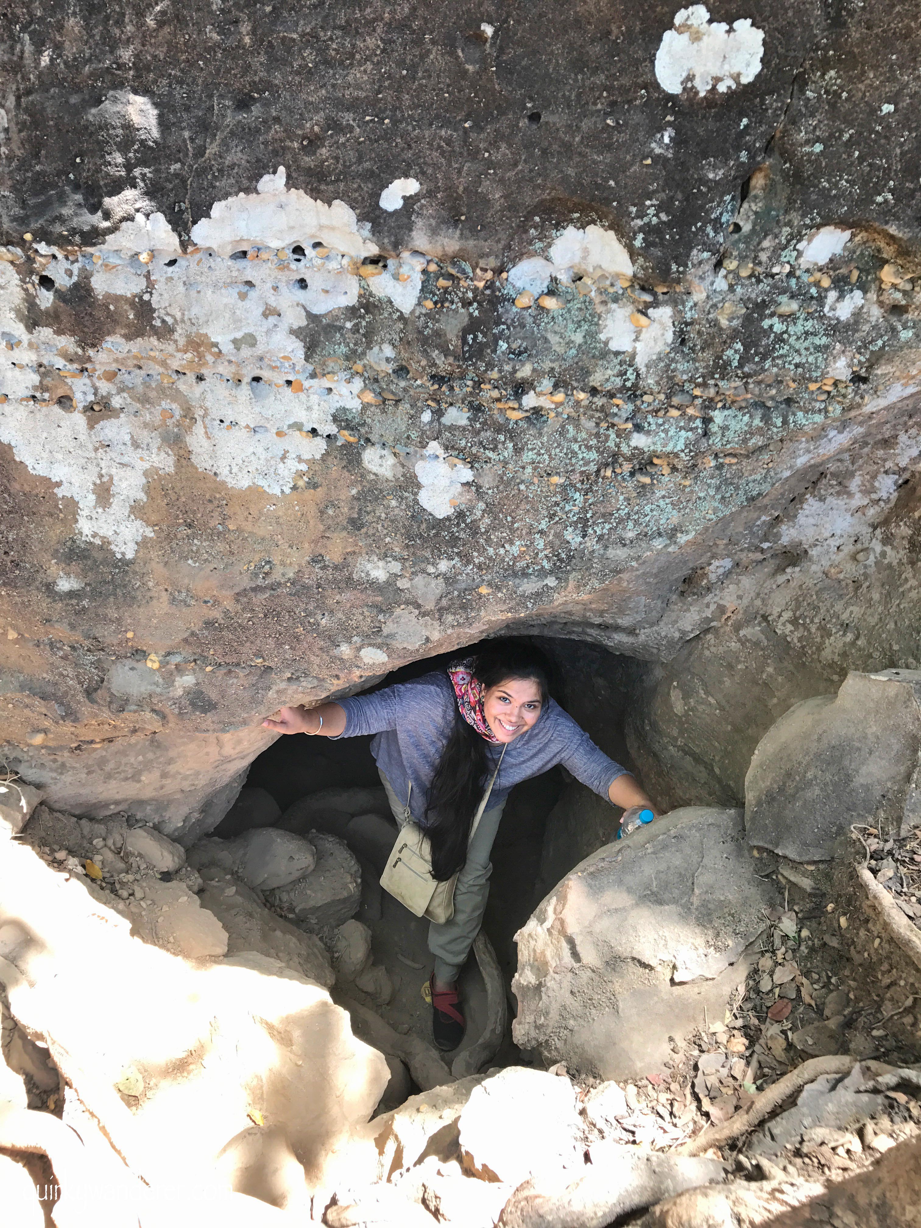 In my cave hopping, I came across another extremely intriguing cave: The Reechgadh caves are a geological wonder. The route to the caves is extremely picturesque and the caves themselves are beyond gorgeous. It is a 15 minute climb but absolutely worth it. Kusum trees add colour to the rocky terrain as I walked on twisted tree roots.