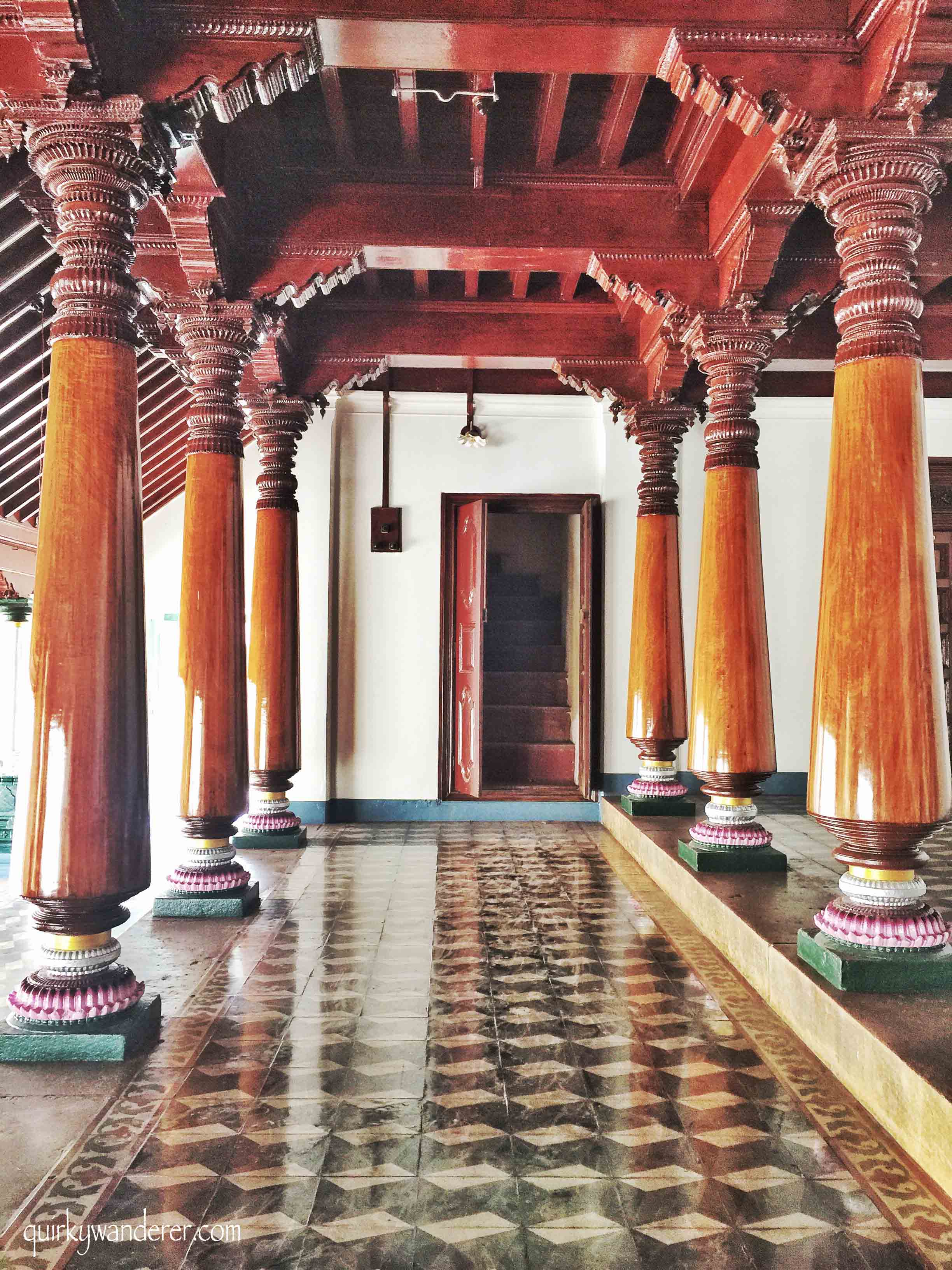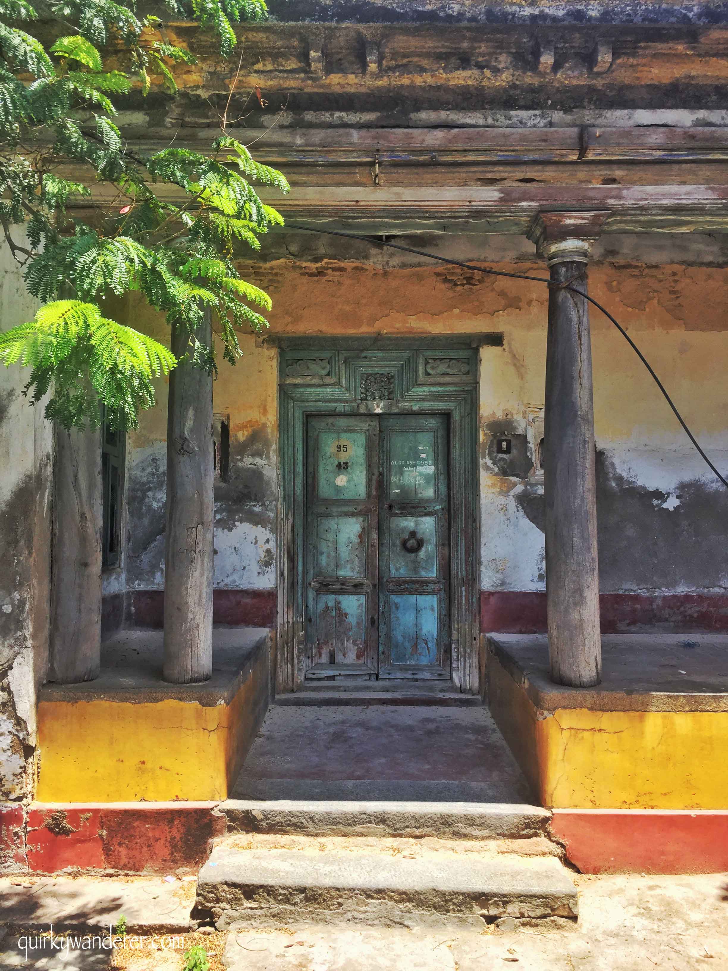 A typical Chettinad mansion with gorgeous wooden pillars, pretty tiles, massive courtyards and intricately carved Burma teak doors.