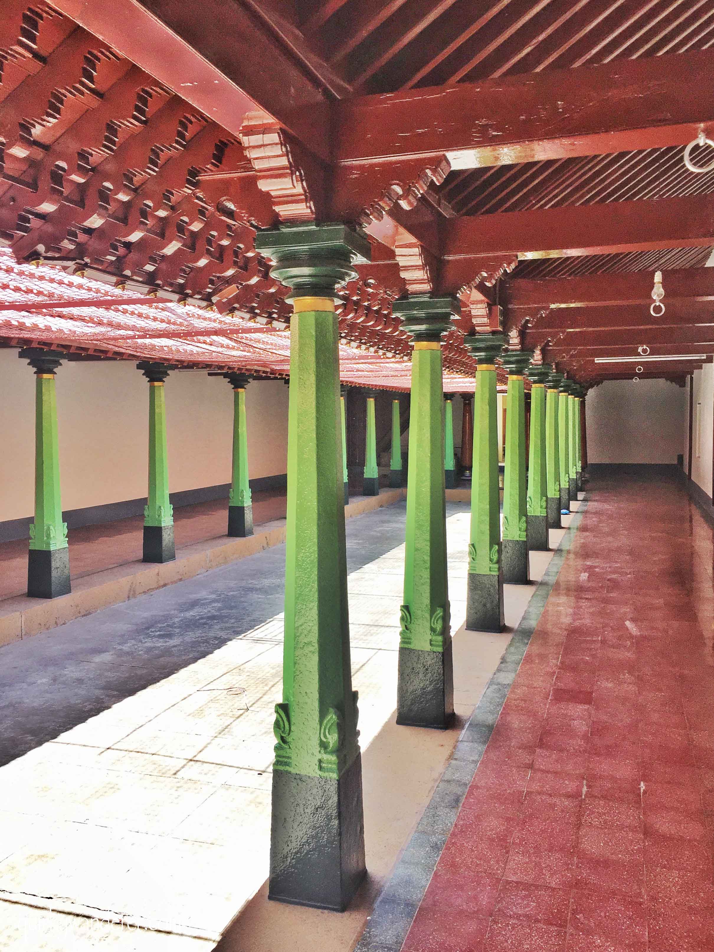 My voice echoed across the deserted corridor. The only noise is of the sweeping footsteps of the caretaker of this Chettinad mansion in Karaikudi. Numerous colourful pillars flank the enormous courtyard as the scorching sun bakes the already scalding floor, devoid of cover.