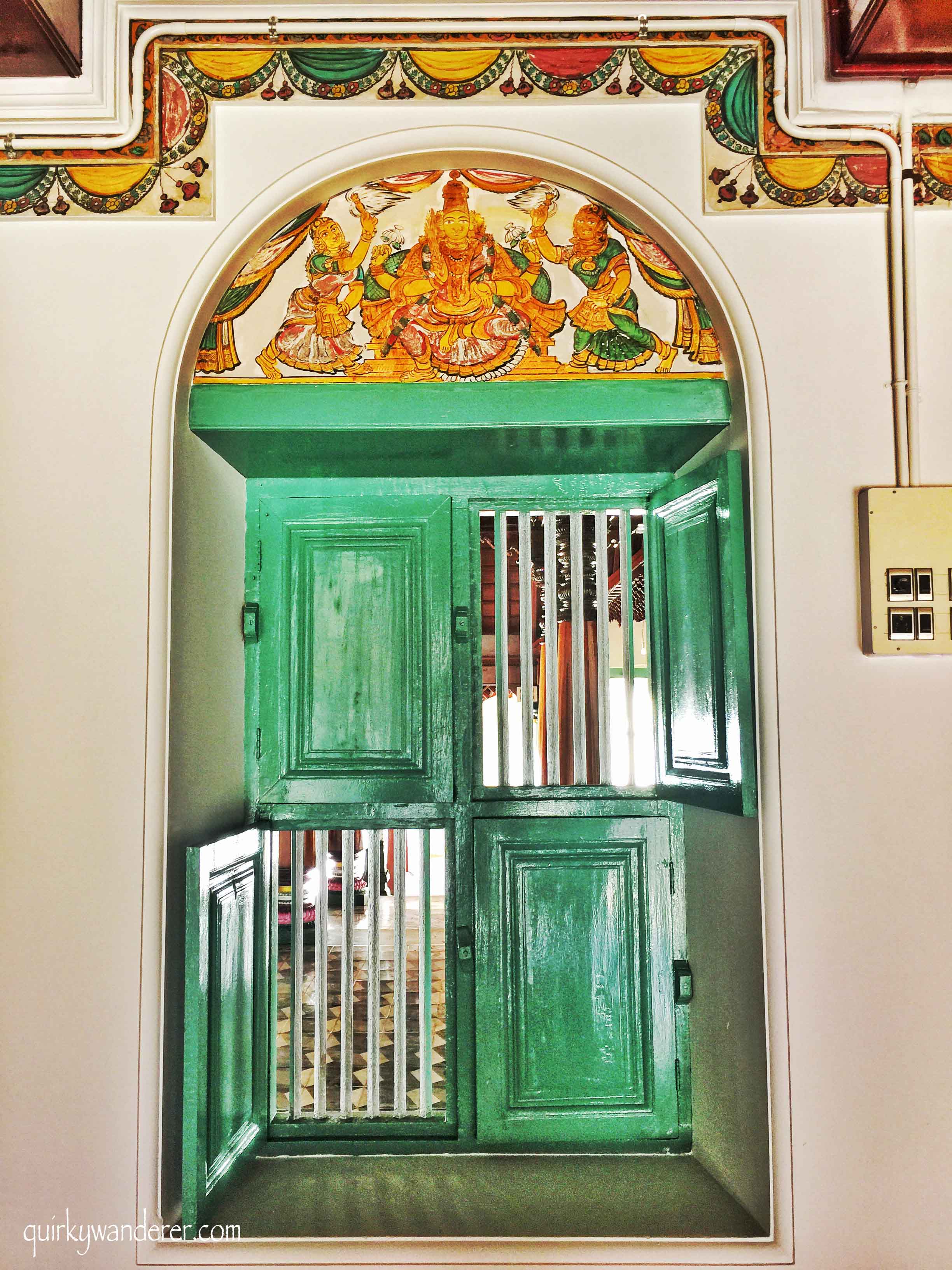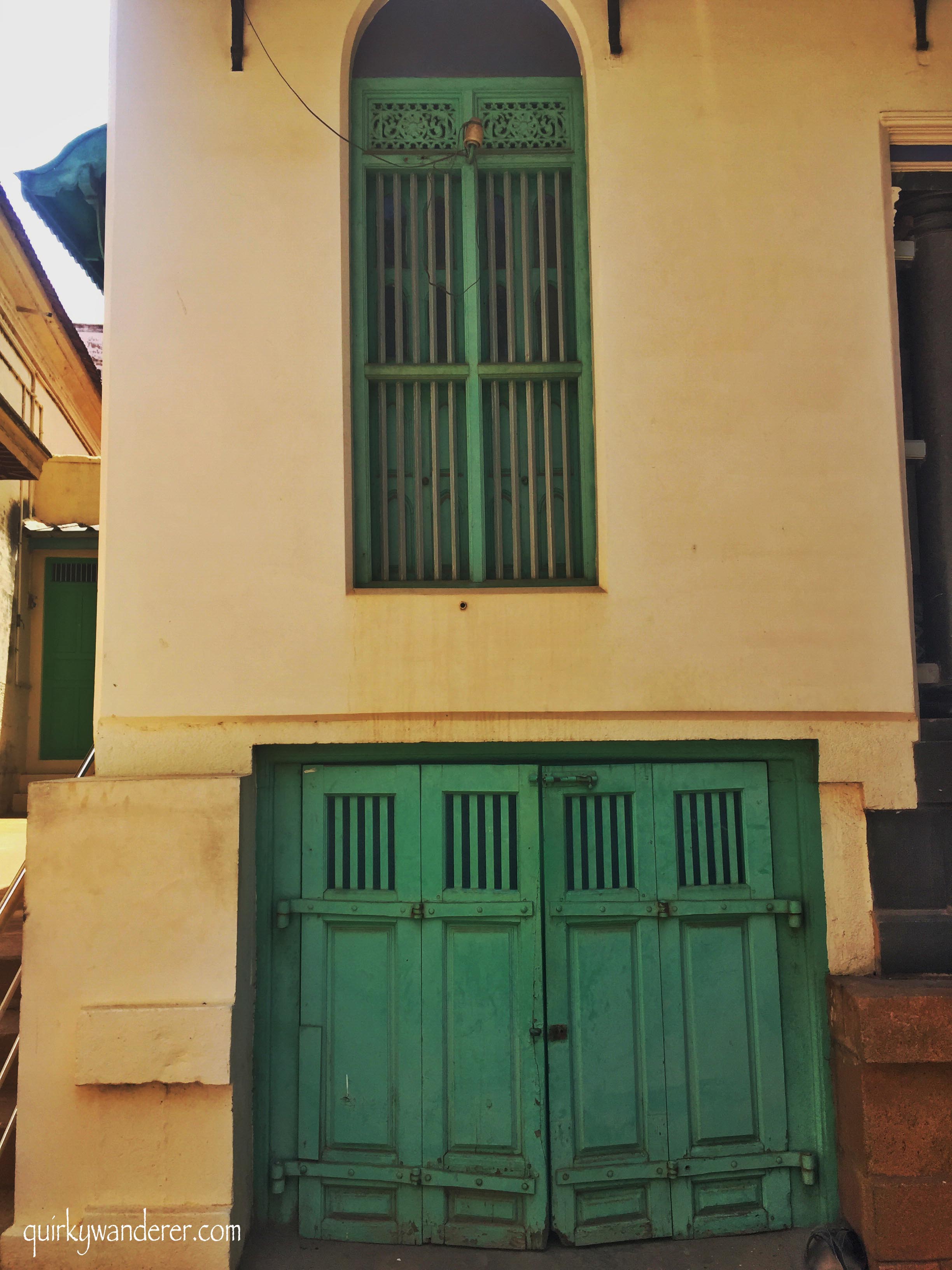 While we are at the doors, it wouldn’t be wrong to say that the doors of the Chettinad mansions in Karaikudi are pieces of art. Each door is approximately 150 years old, built in rock solid Burma teak and it took close to 2.5 years to built one. The carvings on these ornamental doors are impeccably intricate and have elaborate panels not the top. Flanked on either side are statues : On one hand is a British soldier riding a horse and on the other is an Indian Sepoy. I was astounded at the triple security system of the door, which made a bell sound every time the key turned!