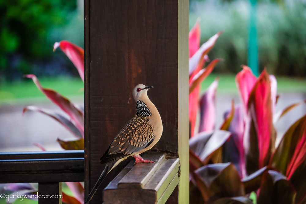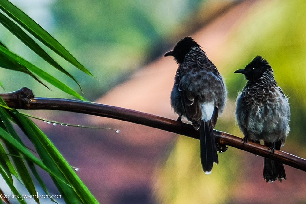 The more daring Spotted Dove sat on the wooden railings of the balconies, peering inquisitively at my camera. The nosy Red-vented bulbuls rummaged for bits of leftover food and then happily perched themselves atop a tree.